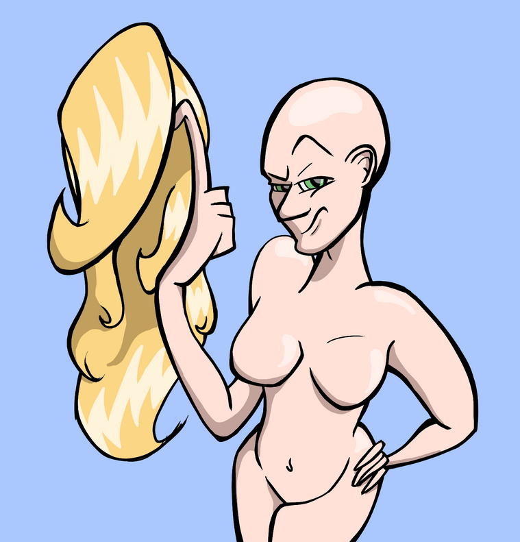 I've been imagining Phoebe as naturally bald since early 2022, but I don't think I ever revealed it publicly before, so enjoy this Scalp Reveal! Essentially, I asked myself the question of how Phoebe could possibly keep her hair organized when it can stretch to 300 times its normal length. I originally considered that maybe her hair was always naturally short, and she simply could extend it to its usual length at will, thus eating up all the extension, but that would require constant attention given to her hair, and require it to be electrically "wired in" to the rest of her body, which might have been interesting! However, I like the idea of Bendies having weird features to them, and if Phoebe gets to be the stretchiest woman in Canada, she should have at least some drawbacks, I think!