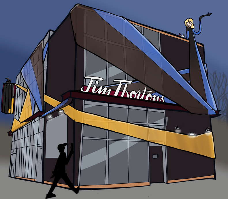 This is probably my most ambitious drawing to date, and I am quite proud of it! I wanted to practice drawing Phoebe interacting with objects to get a feel for her texture, and I also wanted to show her really stretch out, so I figured she could wrap around a building, and I thought it would be funny to have it be a coffee shop, specifically the first Tim Hortons, recently renovated. But then I also figured I could practice drawing buildings, and with my recent inking practice, I wanted to try inking this one to see if I could do it, and then I ALSO wanted to show Phoebe's tendency to go translucent when she stretches really far, and um, yeah. You can see how it kinda spiraled, but I was up to the challenge!